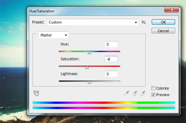 - if you’re not satisfied with the results, you can also change the saturation of the image. Go to Image > Adjustments > Hue/Saturation and decrease the saturation to -8.