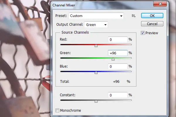 - Adjust the Channels by going to Image > Adjustment > Channel Mixer. Click on the Green Channel in the dropdown menu, and change the Green to +96 in order to give the photo less of a green effect.